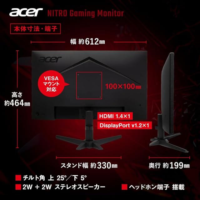 商品名:Acer 27インチ フルHD 144Hz 1ms(VRB) IPS 非光沢 sRGB 99% AMD FreeSync ブラックブースト VRB対応 ブルーライト低減 HDMI 1.4 DisplayPort v1.2 スピーカー・ヘッドホン端子 Acer Display Widget 6軸カラー調整 VESAマウント対応 Nitro ゲーミングモニター QG271P6bmipx
