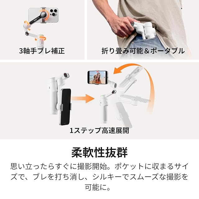 簡単セットアップ&安定した映像:スマホをマウントし、展開するだけで、このスマホジンバルは準備完了。3軸手ブレ補正は、どんな状況でも、すべてのショットを絹のように滑らかに保ちます。