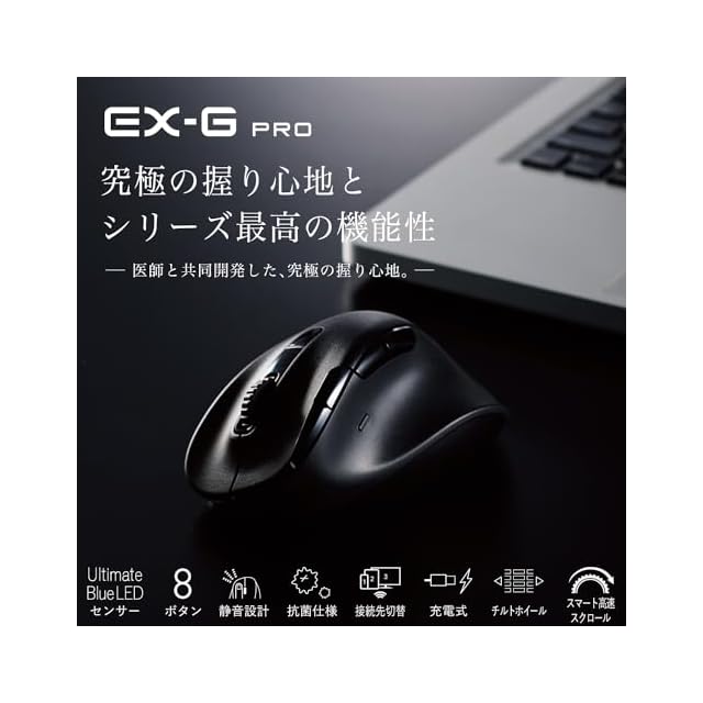 医師と共同開発した究極の握り心地とシリーズ最高の機能性を実現した8ボタンマウス"EX-G PRO"。