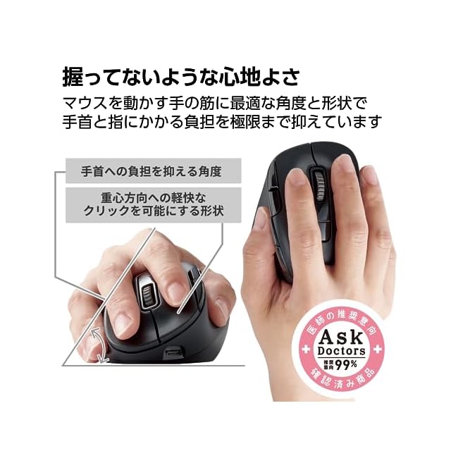 整形外科医と共同開発した、自然な手の形のまま使える握らないマウス“EX-G"シリーズ。作業効率を向上させる8ボタンに加え、チルト対応スマート高速スクロール、最大3台のマルチ接続、繰り返し使える充電式など、シリーズ最高の機能性を搭載した、PROモデルのSサイズです。