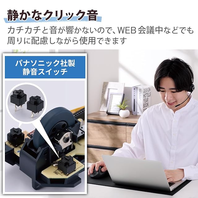 気になるクリックのカチカチ音が響かないため、会議中のパソコン操作や在宅勤務時の早朝・夜間の作業などでも気にせず使用できます。