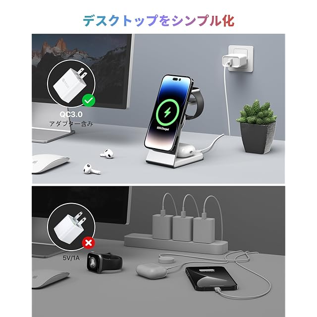 iPhone を本体に近づけるだけで正しい位置に吸着します。同時にiPhone/Apple Watch/Airpodsに充電して、ケーブルから解放され、ひっかかることはありません。