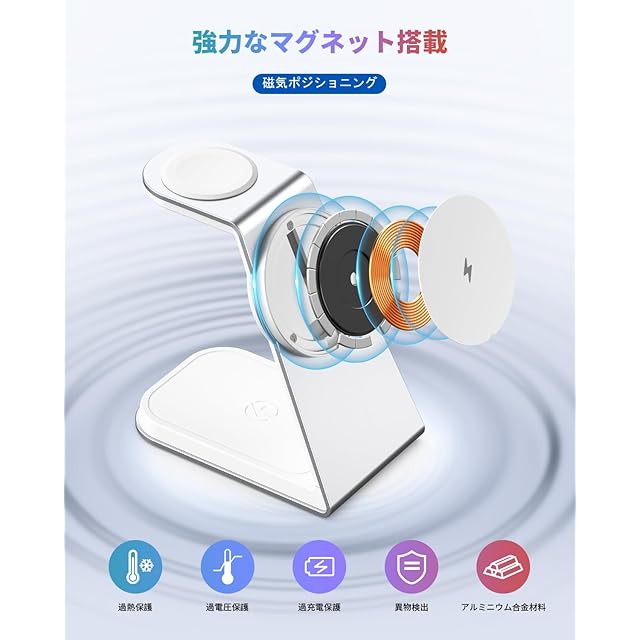【2025年進級プロ3in1magsafe充電器】本体には塊ごとの強力なマグネットを内蔵し、塊ごと磁石はいくつかの小さな磁石に比べて磁力が40%増強されています。磁力の安定性を大きくに引き上げました。 iPhone を本体に近づけるだけで正しい位置に吸着します。同時にiPhone/Apple Watch/Airpodsに充電して、ケーブルから解放され、ひっかかることはありません。