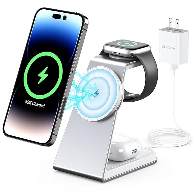 【2025年進級プロ版 Qi認証済み】TEPNICAL 3in1 Magsafe充電器 ワイヤレス充電器 スタンド 20W出力 置くだけ マグネット式充電 iPhone 16/15/14/13/12 seris/Galaxy S20/S10/S10+/S9/Airpods 2/3/pro/Apple Watchに対応 日本語説明書付き 20WQC3.0アダプタ付属 シルバー
