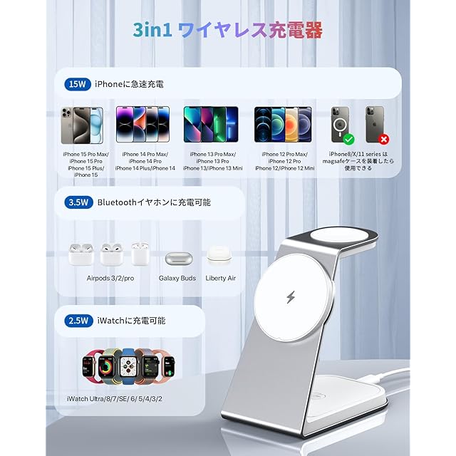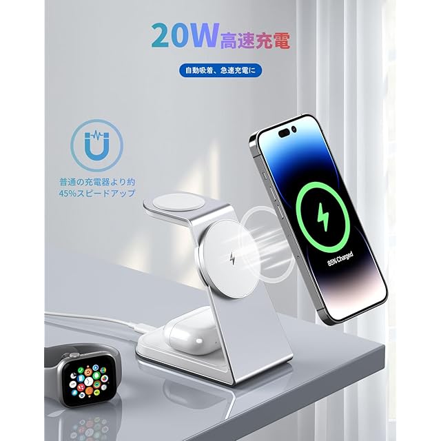 商品名:【2025年進級プロ版 Qi認証済み】TEPNICAL 3in1 Magsafe充電器 ワイヤレス充電器 スタンド 20W出力 置くだけ マグネット式充電 iPhone 16/15/14/13/12 seris/Galaxy S20/S10/S10+/S9/Airpods 2/3/pro/Apple Watchに対応 日本語説明書付き 20WQC3.0アダプタ付属 シルバー