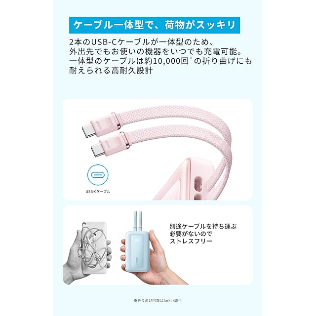 ケーブル一体型で、荷物がスッキリ:2本のUSB-Cケーブルが一体型のため、外出先でもお使いの機器をいつでも充電可能です。付属ケーブルは約10,000回の折り曲げにも耐えられる高耐久設計です。