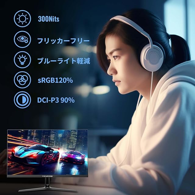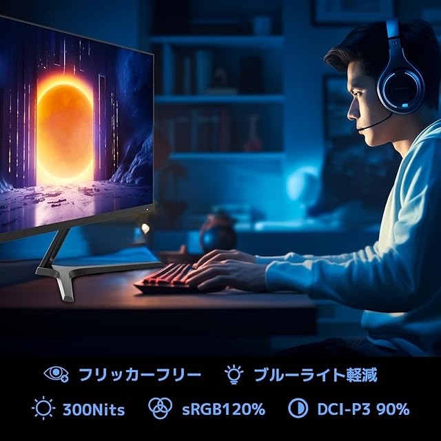 1、[画面サイズ] 27インチ IPS モニター 、[最大解像度] 1920×1080、[アスペクト比] 16:9、[コントラスト比] 1000:1、[輝度] 300cd/㎡ 、[色域] DCI-P3 90%,sRGB 120% 、[色深度] 16.7万色、8Bits、HDR対応。
