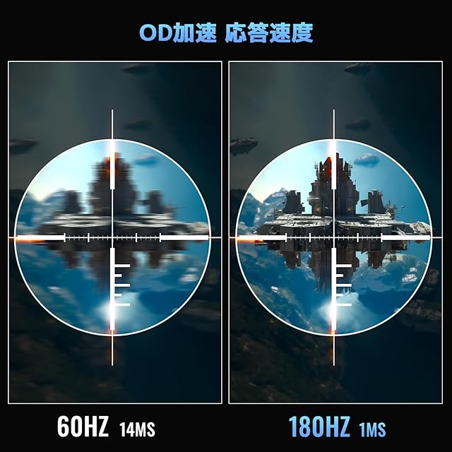 2、[リフレッシュレート] 180Hz(DP/HDMI用)、[応答速度] 5ms(OD 1ms)、[角度調整] 前後角度(-5°から20°+/-2°)、178°広視野、ブルーライト軽減、フリッカーフリー、AMD FreeSync、VESA対応(100mm x100mm)。