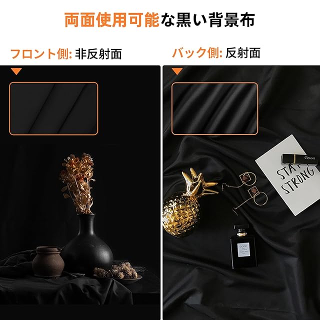 反射面と無反射面がある設計:この黒布は表面がピーチスキン加工で、少し起毛感があります。黒 布の裏面は滑らかな設計で、様々な撮影場面に対応できます。★背景 布 黒にパイプ差し込む袋があるので、パイプに差し込んで使用したり、強力クリップでクロスバーに固定したりして使用できます。