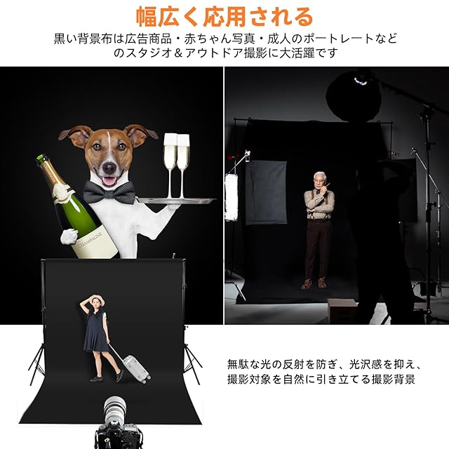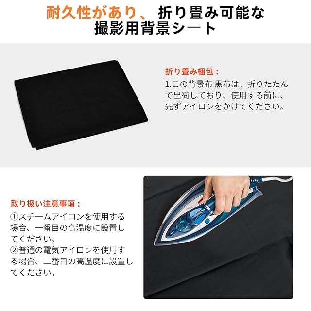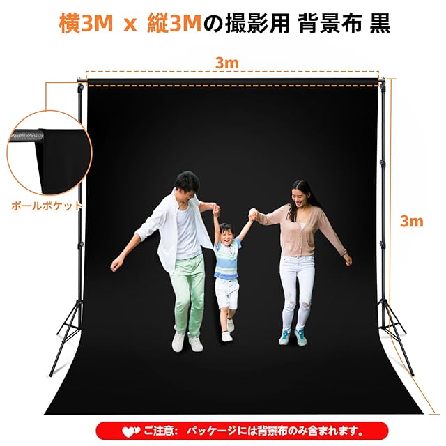 パッケージ内容:300cm x 300cmの背景布 黒 布×1枚 ★ご注意:背景布 黒布は折り畳んで出荷しており、もし届ける際にしわがある場合、使用前に先ず低温アイロンをかけてください。