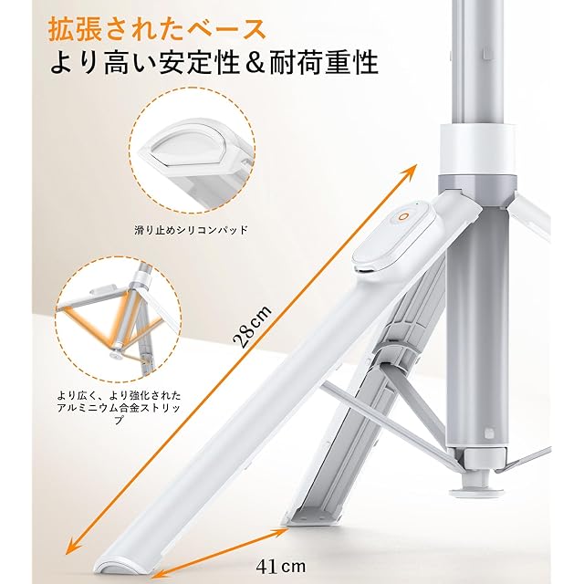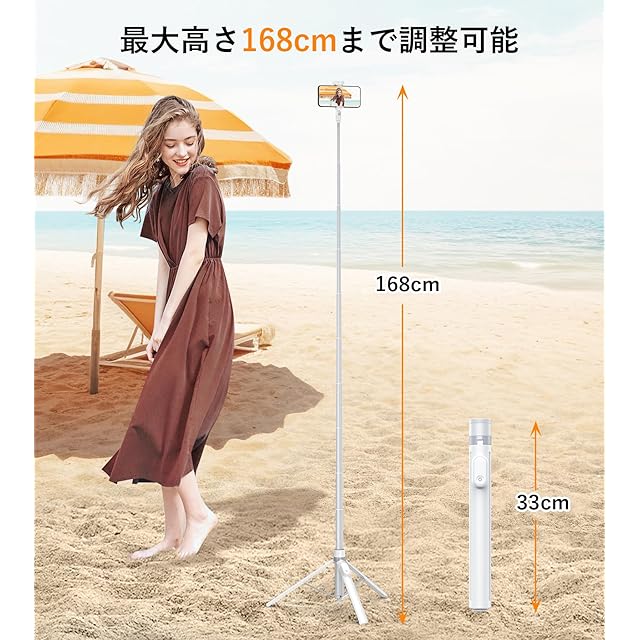 最大高さ168cm:この自撮り棒 兼 三脚は、最大高さ168cmの10段階伸縮式ポールを採用しており、広い視野での撮影を可能にし、さまざまな視覚体験を提供します。高級感あふれた伸縮ポールはアルミニウム合金製で、耐摩耗性と耐腐食性に優れており、湿度の高い環境でも問題なく使用できます。