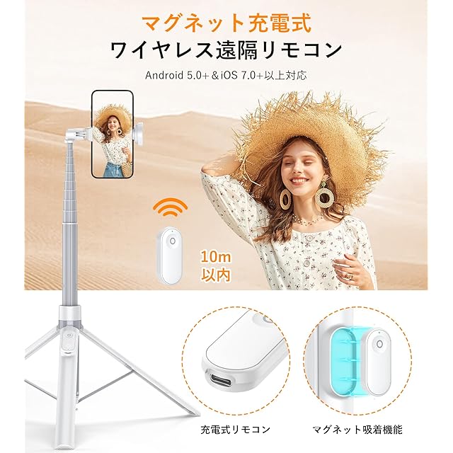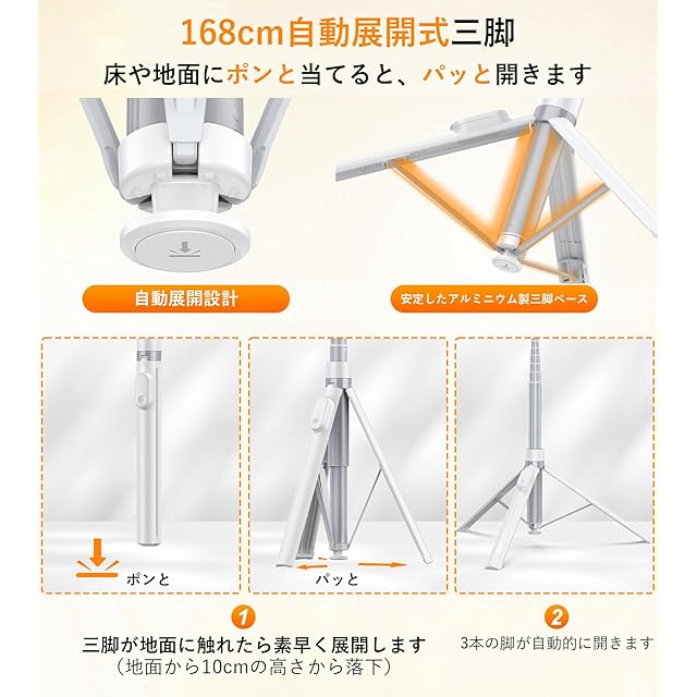 商品名:TONEOF 自動三脚 168cm スマホ 三脚 自撮り棒 携帯 三脚 スタンド じどりぼう セルカ棒 磁気充電式リモコン付き オートオープン 150cm以上 360°回転可能 安定 ロング iPhone/Androidに対応(白)