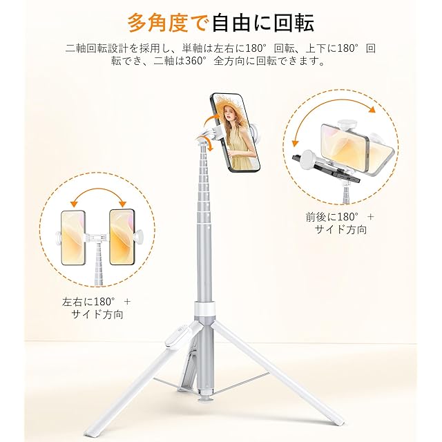 収納一体&二軸回転:アイホン用三脚は、2つのスイベルシャフトを備えており、上部のシャフトは上下に180°回転でき、下部のシャフトは左右に180°回転します。これにより、合計で360°の回転角度が可能です。トップショット、バックショット、横画面と縦画面の切り替えなど、さまざまな撮影が簡単に行え、撮影の利便性が向上します。