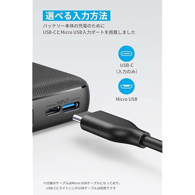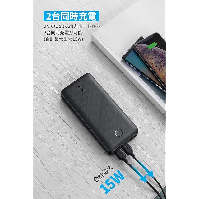 <b>Anker PowerCore Essential 20000</b><br> 2台同時充電可能な超大容量モバイルバッテリー<br><br> <b>主な製品仕様</b><br> サイズ:約158 x 74 x 19 mm<br> 重量:約343g<br> 入力:5V = 2A<br> 出力:5V = 3A (各ポート最大2.4A)<br><br> <b>Anker: 全米で人気のUSB充電機器ブランド</b><br> - 最先端技術よる高速かつ安全な充電<br> - 3000万人以上が支持する信頼の品質<br><br> <b>2台同時にフルスピード充電</b><br>Anker独自技術PowerIQとVoltageBoostにより、ほとんどのUSB機器に対し、最適なスピードで充電が可能です (*Qualcomm Quick Chargeには対応しておりません) 。また、低電流モードも搭載されており、イヤホン等の小型電子機器やウェアラブル機器に最適な電流で充電することができます。<br><br> <b>万が一の備えに</b><br> 万が一の際は緊急災害対策用として利用可能。20000mAhの超大容量かつ、2ポート搭載でご家族や知人と2台同時に充電することができます。<br><br> <b>選べる入力方法</b><br> バッテリー本体の充電のために、USB-CとMicro USB入力ポートを搭載しました。お使いのケーブルに合わせてお選びいただけます。(※2つの入力ポートを同時に使用しないでください)。(本体充電時間: 約10.5時間 ※5V=2A以上の出力の充電器使用の場合)。<br><br> <b>低電流モード搭載</b><br> 低電流モードも搭載されており、イヤホン等の小型電子機器やウェアラブル機器に最適な電流で充電することができます。<br><br> <b>高い互換性</b><br> 高い互換性を持ち、Phone 11 / 11 Pro / 11 Pro Maxを含む最新のiPhoneなど幅広いあらゆるUSB機器に対してフルスピード充電が可能です。<br><br> <b>対応機種</b><br> スマートフォン<br> iPhone 11 / 11 Pro / 11 Pro Max / XS / XS Max / XR / X / 8 / 8 Plus<br> Galaxy S10 / S10+ / S9 / S9+<br> Google Pixel 3 / 3 XL<br> Nexus 6P / 7 他<br><br> タブレット端末<br> iPad Pro (2018, 11インチ) / iPad mini 5 他<br><br> <b>注意:</b><br> ・本製品には、USB-Cケーブル、ライトニングUSBケーブル、ACアダプターは付属しておりません。<br> ・イヤホンやスマートウォッチ等の入力電流が低い製品には「低電流モード」をご利用ください。電源ボタンを2秒または2度押すと本モードへ切り替わり、緑色のインジケーターが1つ点灯します。<br> ・2つの入力ポートを同時に使用しないでください。USB-Cポートは入力専用です。<br>