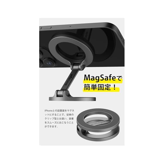 【MagSafeで固定】iPhoneとの設置面をマグネットにすることで、従来のクリップ型とは違い、装着が簡単に。iPhone 12以降のMagSafe対応機種を強力なN52ネオジム磁石でしっかりと固定。縦向き、横向きどちらでも自由自在に設置可能。