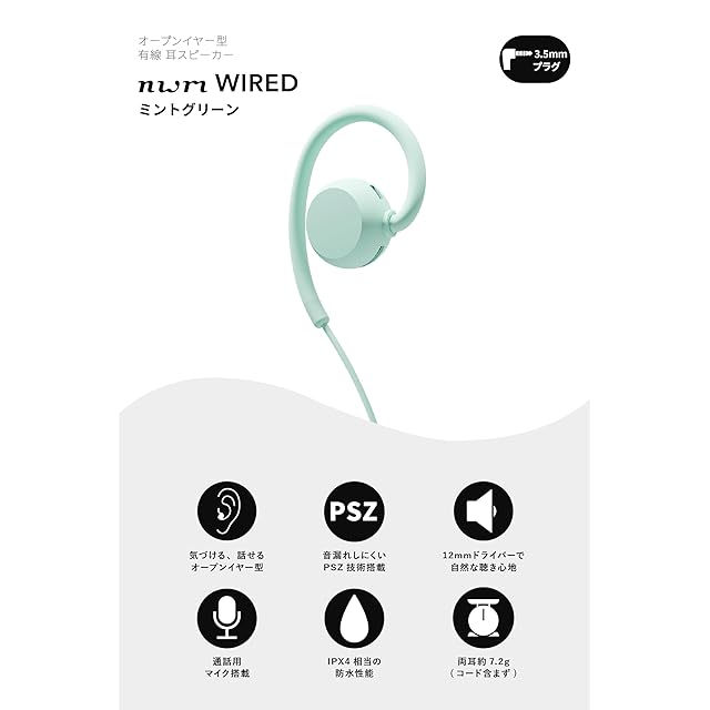 商品名:nwm (ヌーム) オープンイヤー イヤホン 有線 型 WIRED MWE006 耳スピ │ 3.5mmジャック 防水 IPX4 両耳 マイク付き 軽量 耳をふさがない 5色展開 ミントグリーン