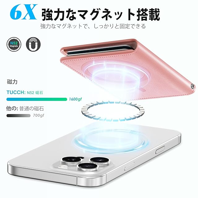 商品名:[TUCCH] スマホカードケース 磁気吸着 6枚カード収納 [RFIDブロッキング] PU合皮 脱着簡単 軽量 背面 カードウォレット 磁気ウォレットケース iPhone 16/15/14/13/12シリーズ対応 ローズピンク