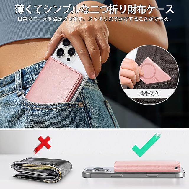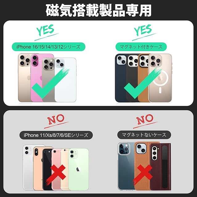 【幅広い互換性】このスマホカードケースはiPhone16/16 Plus/16 Pro/16 Pro Max/iPhone15/15 Plus/15 Pro/15 Pro Max/iPhone 14/14 Plus/14 Pro/14 Pro Max/iPhone13/13 Pro/13 Pro Max/iPhone12/12 Pro/iPhone 12 Pro Maxに対応します。ご注意:本商品はただ磁力吸着機能搭載のスマホやスマホケースだけに対応できます、(iPhone11/11Pro/11 Pro Max/7/8/SE2/SE3/XS Max/Xs/XRに対応しません)。ご購入前に、対応機種をしっかりとチェックしてください。