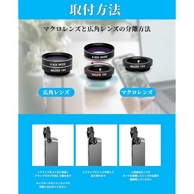 【この情報を見てください。】広角レンズとマクロレンズは一緒に置いてあります。広角レンズを使うには、二つのレンズを一緒にクリップに固定すればいいです。マクロレンズを使うには、広角レンズを離すだけでいいです。