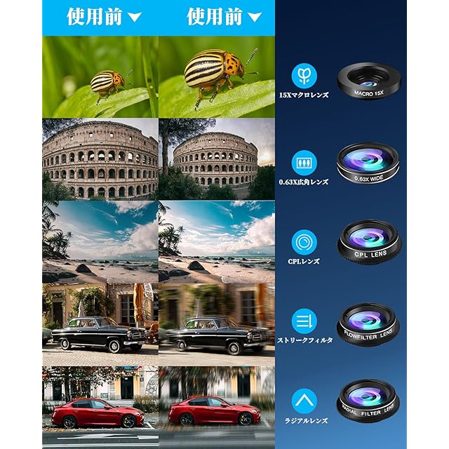 【高品質の光学ガラスレンズ】優れた光透過性と解像度の高いレンズにより、画質劣化の原因となる諸収差を低減し、画面全域で高画質な描写を実現、撮影が楽しめます。安価なプラスチック製ではなく、非常に専門的なアルミ製の製品で、アルミ製品は耐久性があります。クリップを携帯電話のカメラに設置し、レンズと携帯電話のカメラレンズの位置を確保します。スマートフォンのカメラを専門のカメラとして使います。もっと専門的な写真を撮って、技術画像の効果を享受します。【取付簡単!挟むだけで使用可能】面倒な設定は不要。スマホカメラに挟むだけで撮影できます。使いたい時にすぐ装着でき、いつでもどこでも写真撮影を楽しめます。