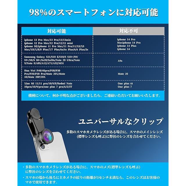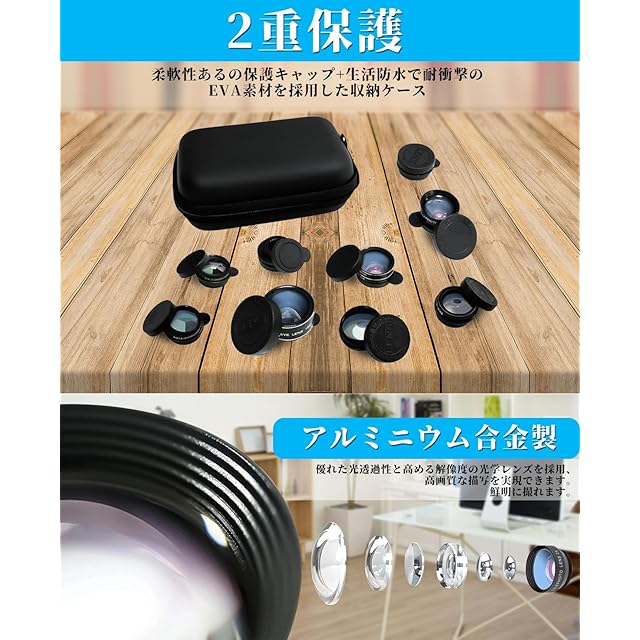 【収納&お手入れの心配もいらない】専用収納ケースが付属。保護キャップもあり、レンズを保護できます。持ち運び便利!また、クリーニングクロスも付きで簡単にお手入れできます。レンズを傷めることなく埃や塵を落とし拭きむらを残しません。【多機種対応】取り外し可能なクランプ設計は、各種スマートフォンとタブレットコンピュータに適用されます。たとえばiPhone 8/7/6/6 plus/6s/6s plus/Samsung Galaxy/iPad/Samsung/Huawei/Sony/LG/xiaomiなどです。