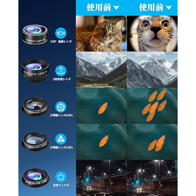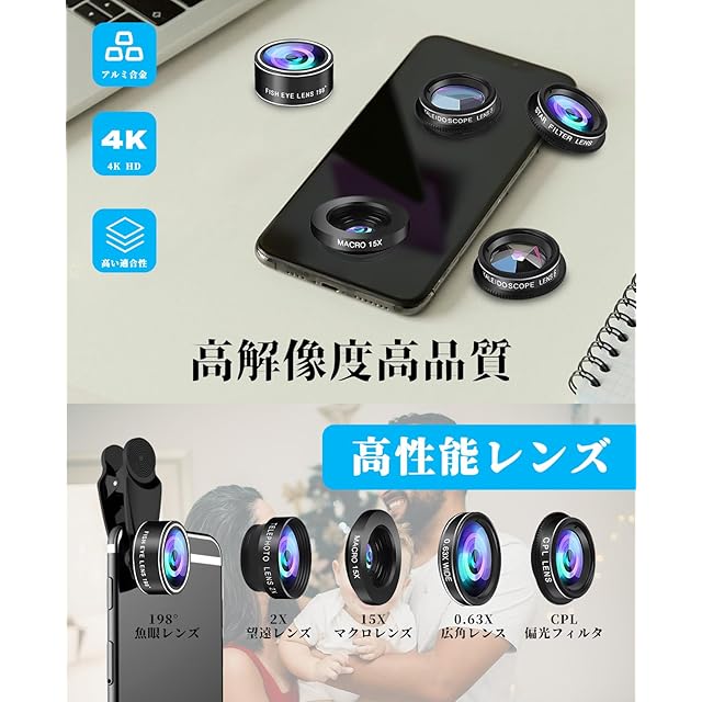 【多機能レンズ】◆マクロレンズ:迫力ある描写や身の回りの小物や花などの肉眼ではとらえることが難しい細部や質感の写真を撮ることができます。◆広角レンズ:通常よりもっと広い画角で撮影可能です。人数の多い自撮りや、パノラマビューの壮大な景色の撮影にお勧めします。◆魚眼レンズ:魚の眼から見た風景のように中心がもり上がった写真を撮影できます。新しい表現をしてみたい方にもお勧めします。◆2倍望遠レンズ:焦点距離を本来の2倍程度に増やすことができます。写真に迫力を出したい方にお勧めします。◆特殊効果フィルター:クロスフィルター、CPL偏光フィルター、万華鏡フィルター、ストリークフィルター、ラジアルフィルター等6種類の特殊効果フィルターもあり、写真を印象的に仕上げることができます。