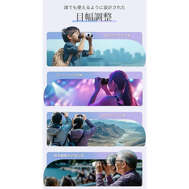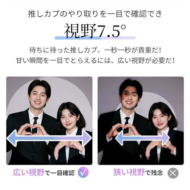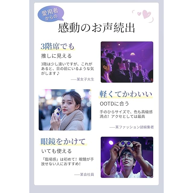 【 高倍率20倍・広視野75度 】双眼鏡 ライブ用は20倍のズームを備えており、ドーム、アリーナ、スタジアムなどの大規模な会場での使用に最適です!高倍率ズーム×75度の超広視野により、遠くの座席からでもステージ上の表情を鮮明かつ広範囲に見ることができ、ライブパフォーマンスの臨場感を一層高めます。また、オペラグラスとしても使用可能で、お気に入りのアイドルのイベントにも最適です。