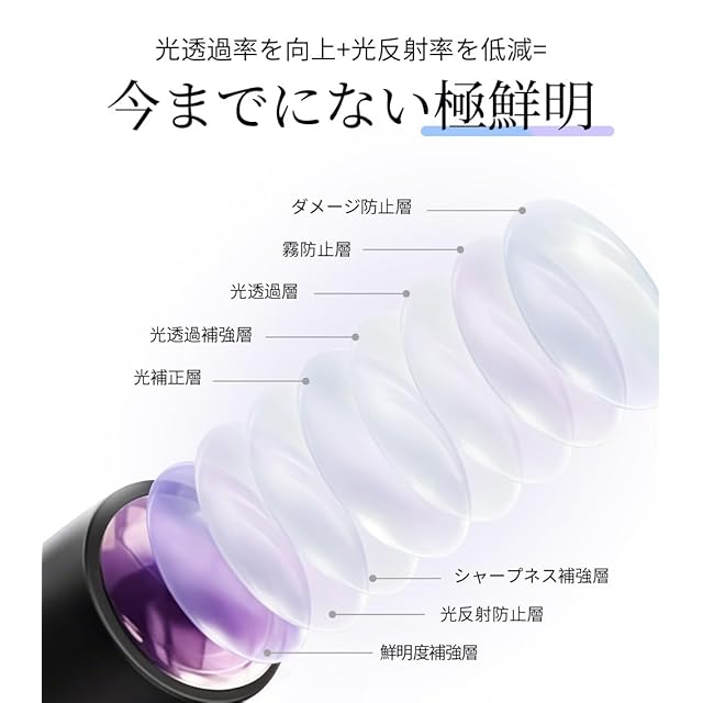 【最先端光学レンズ・99.9%透過率】新しく開発された全光学双眼望遠鏡は、従来の樹脂レンズではなく、高品質なガラスレンズを採用しており、ナノ単位で研磨した9層ものフルマルチコーティングにより、視野の「明るさ」を飛躍的に高めました。透過率は99.9%に達し、光の損失を最小限に抑えることで、驚くほど鮮明でクリアな映像を実現しました。