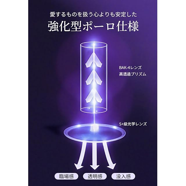 【高級BaK4プリズム 】光学性能に優れた高級BaK4プリズムを標準装備したため、レンズ性能を極限まで引き出す。ポロプリズム方式により像の歪みを最小限に抑え、隅々までクリアでシャープで高鮮明な視界を実現します。