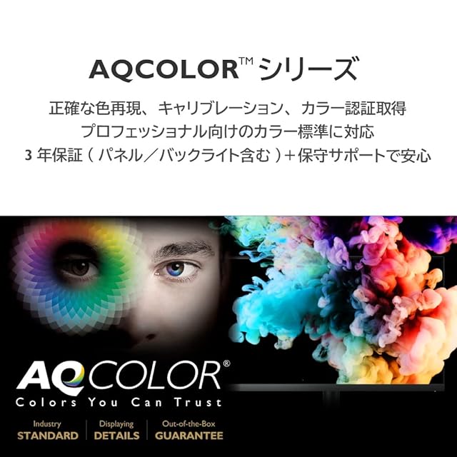 sRGB・Rec.709カバー率99%、Pantone/CALMAN認証を取得したAQCOLORシリーズ製品。出荷時の個別キャリブレーションにより、高いカラーパフォーマンスで高水準の色精度を実現。