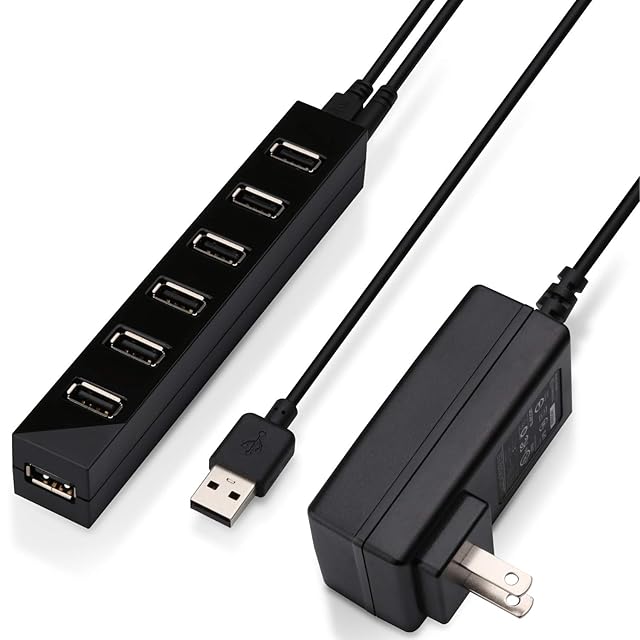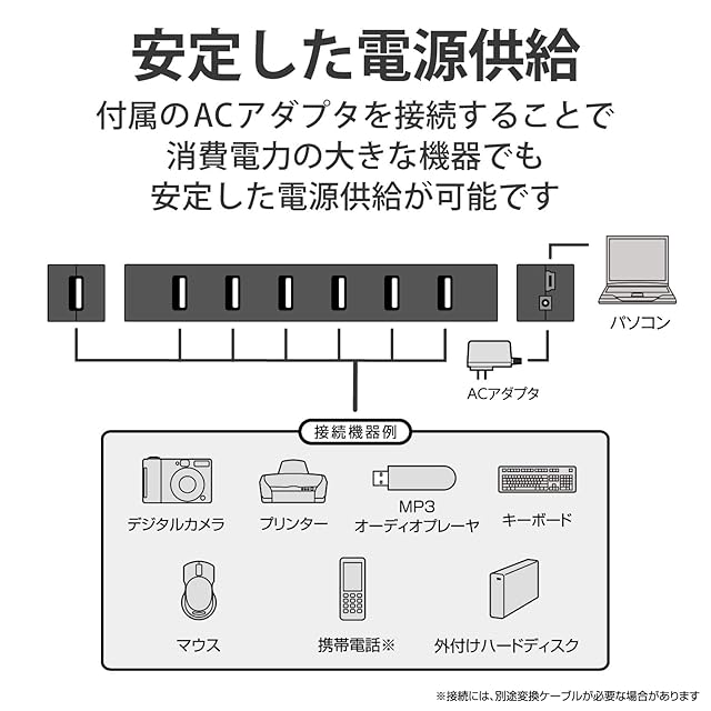 大容量電力のACアダプターが付属していますので、7個のUSB機器を同時に接続しても電力が不足せず、安定した動作を実現します(※)。