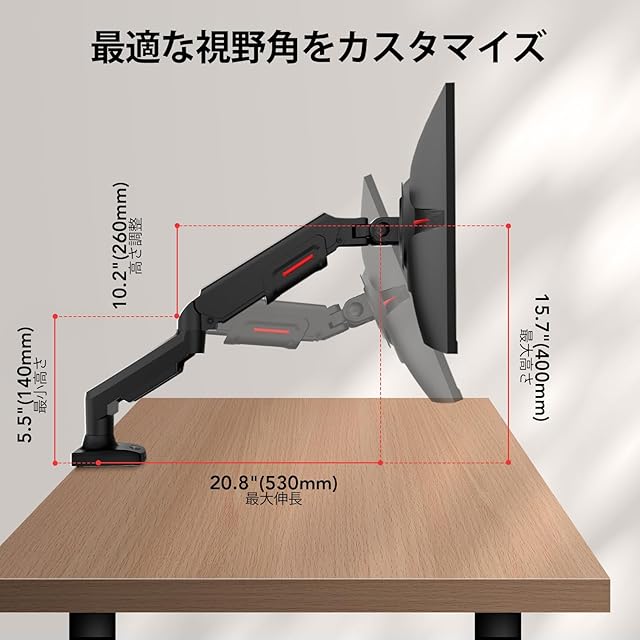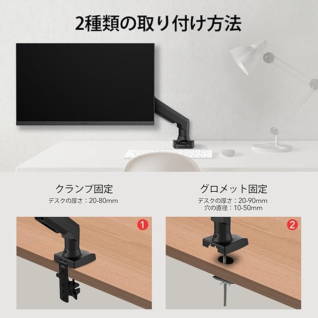 【ご購入前に】①モニターアーム対応サイズ:17~32インチ;耐荷重:2-9kg②VESA規格:75mm/100mmに対応③取付可能天板:[クランプ式]厚さ:20-80mm;[グロメット式]厚さ:20-90mm,取付穴の直径:10-50mm ご注意:クランプマウントは、以下のタイプのデスクには対応していません:デスクの縁に外枠があります;デスクの縁に傾きや凹凸があります。