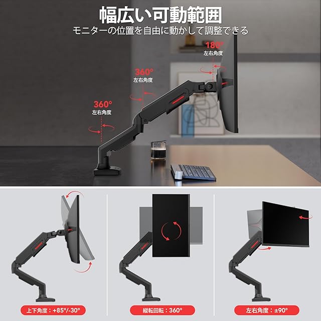【快適な視聴姿勢に調整可能】PCモニターの角度や距離などは、ニーズや作業内容に応じて快適な位置に移動させることができます。 ①アーム:高さを調節 ②アーム関節部:360° ③VESAプレート部:+85°/-30°、縦転回転:360°、左右角度:±90° ※ 高さを調節する場合,上アームを水平位置に押し下げ。