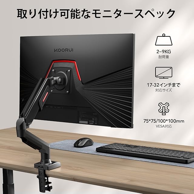 商品名:KOORUI モニター アーム デスクマウント ディスプレイ アーム 1画面 シングル VESAアーム クランプ式&グロメット式 PCモニターアーム 17~32型 耐荷重9kg 多角度調節 ケーブル管理