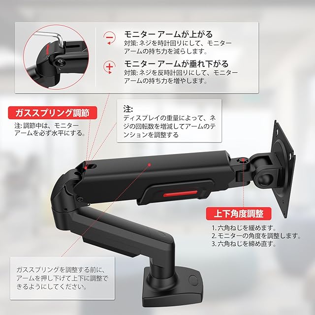 【重要なお知らせ】モニターアームを上下に動かす調整方法は、ビデオ「KOORUIモニターアームの調整方法」をご覧ください。