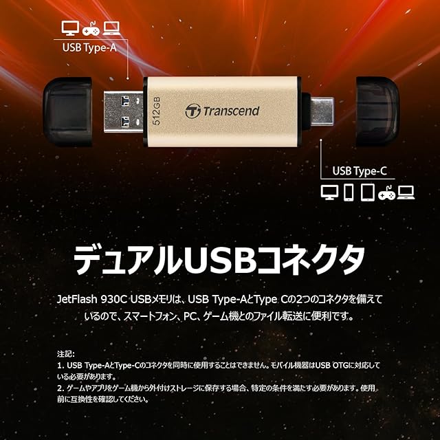 商品名:トランセンドジャパン トランセンド 高速・高耐久USBメモリ 512GB USB 3.2 Gen1 Type-A/Type-C 両対応 PS4/PS5 動作確認済 (最大転送速度420MB/s)【データ復旧ソフト無償提供】TS512GJF930C