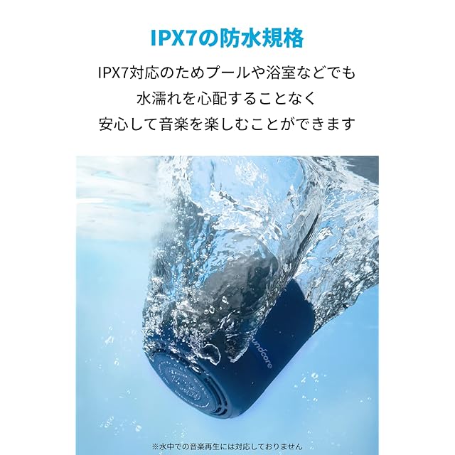 IPX7の防水規格 : IPX7対応により、キャンプなどのアウトドアや浴室内、キッチンなどでも水濡れを心配することなく安心して音楽を楽しむことができます。