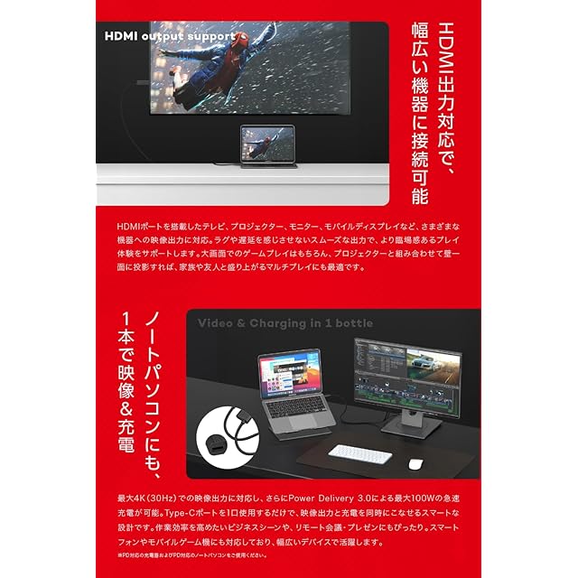【ノートパソコンにも、1本で映像&充電】 最大4K(30Hz)での映像出力に対応し、さらにPower Delivery 3.0による最大100Wの急速充電が可能。Type-Cポートを1口使用するだけで、映像出力と充電を同時にこなせるスマートな設計です。作業効率を高めたいビジネスシーンや、リモート会議・プレゼンにもぴったり。スマートフォンやモバイルゲーム機にも対応しており、幅広いデバイスで活躍します。※PD対応の充電器およびPD対応のノートパソコンをご使用ください。