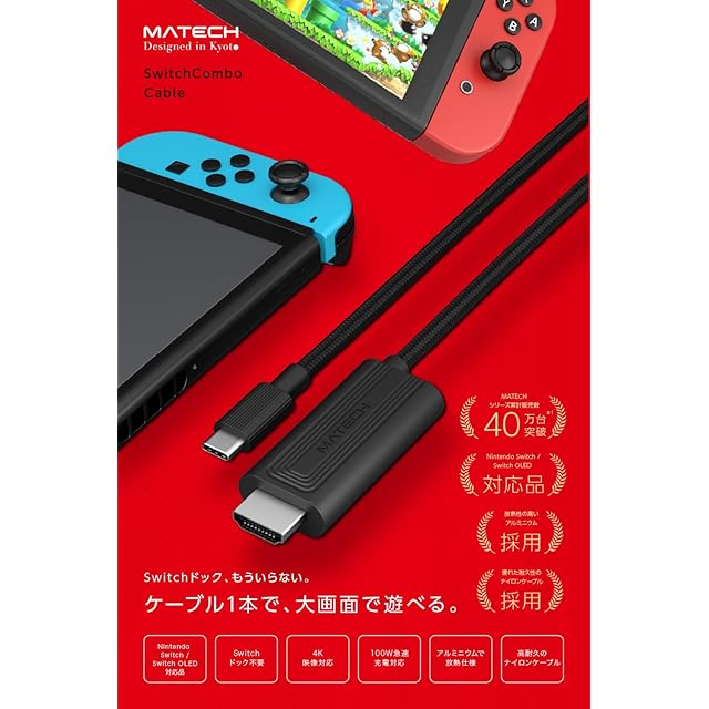 商品名:【国内正規品】MATECH Switch Combo HDMI ケーブル 3in1(HDMI/Type-C/PD100W充電)【ドック不要/テレビ出力/解像度4K(30Hz)】スイッチ Switch OLED ノートパソコン タブレット その他各種機器対応 持ち運び便利 (アルミニウムブラック)