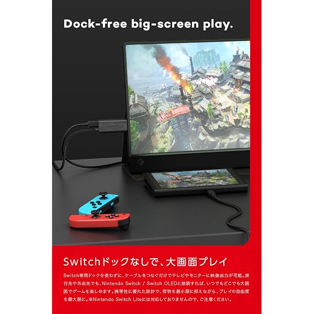 【Switchドックなしで、大画面プレイ】 Switch専用ドックを使わずに、ケーブルをつなぐだけでテレビやモニターに映像出力が可能。旅行先や外出先でも、Nintendo Switch / Switch OLEDと接続すれば、いつでもどこでも大画面でゲームを楽しめます。携帯性に優れた設計で、荷物を最小限に抑えながら、プレイの自由度を最大限に。※Nintendo Switch Liteには対応しておりませんので、ご注意ください。