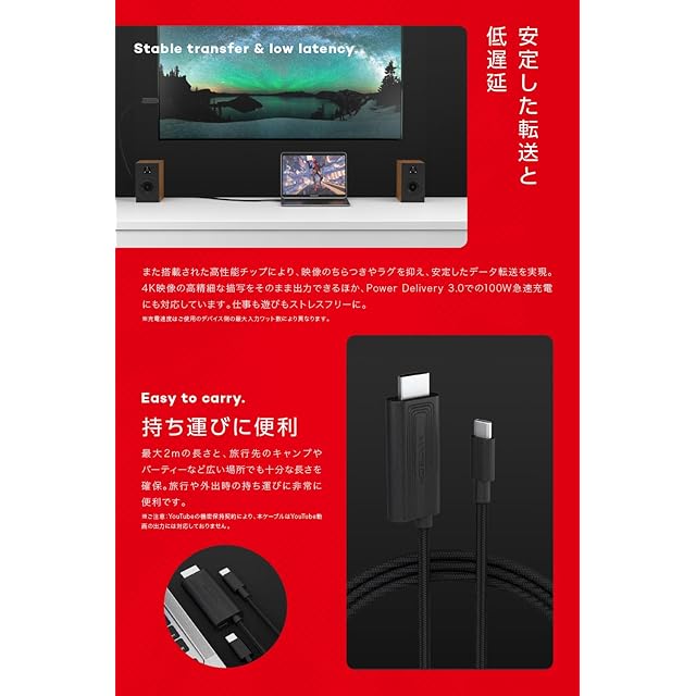 【持ち運びに便利】 最大2mの長さと、旅行先のキャンプやパーティーなど広い場所でも十分な長さを確保。旅行や外出時の持ち運びに非常に便利です。※ご注意:YouTubeの機密保持契約により、本ケーブルはYouTube動画の出力には対応しておりません。
