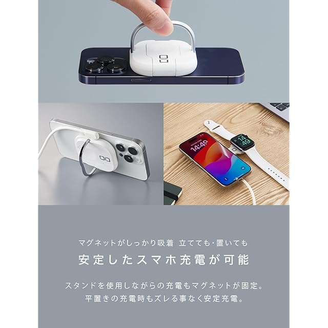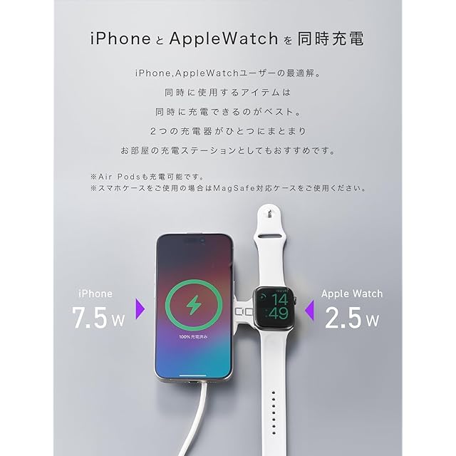 【iPhoneとApple Watchを同時充電】iPhone 15 など、iPhone12以降のmagsafe対応機種とApple Watch(アップルウォッチ)の同時充電が可能です。コンパクトなフォルムに最大15W出力(iPhone充電時は7.5Wが最大出力)と最大2.5W出力、2つの充電器が搭載され、マグネット吸着により適切な位置で充電が可能です。※こちらはApple MFi非認証品です。watchOSのアップデートにより使用できなくなる場合がございます。