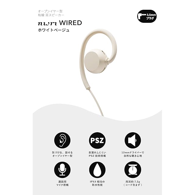 商品名:nwm (ヌーム) オープンイヤー イヤホン 有線 型 WIRED MWE006 耳スピ │ 3.5mmジャック 防水 IPX4 両耳 マイク付き 軽量 耳をふさがない 5色展開 ホワイトベージュ