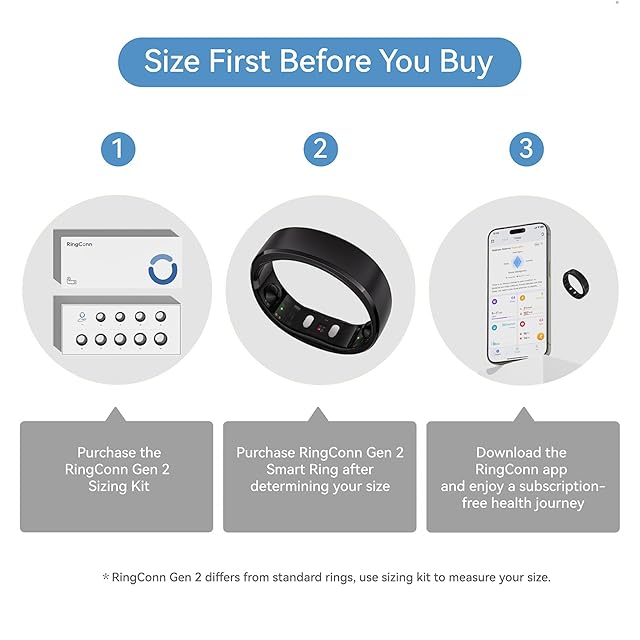 【購入前にサイズ確認】RingConn Gen 2スマートリングは他社の健康リングとは異なる独自のサイズ基準を採用しています。RingConn Gen 2サイズキットを使用することで、指に最も快適で正確なフィット感を見つけられ、購入前に正しいサイズを選択することで返品や交換の手間を防ぎます