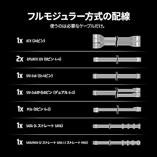 ATX 3.1規格とPCIe 5.1に準拠した電源ユニットです。12V-2x6コネクターを搭載しており、GeForce RTX 40シリーズにも対応できます。最大600Wに対応した12V-2x6ケーブルを付属しています。