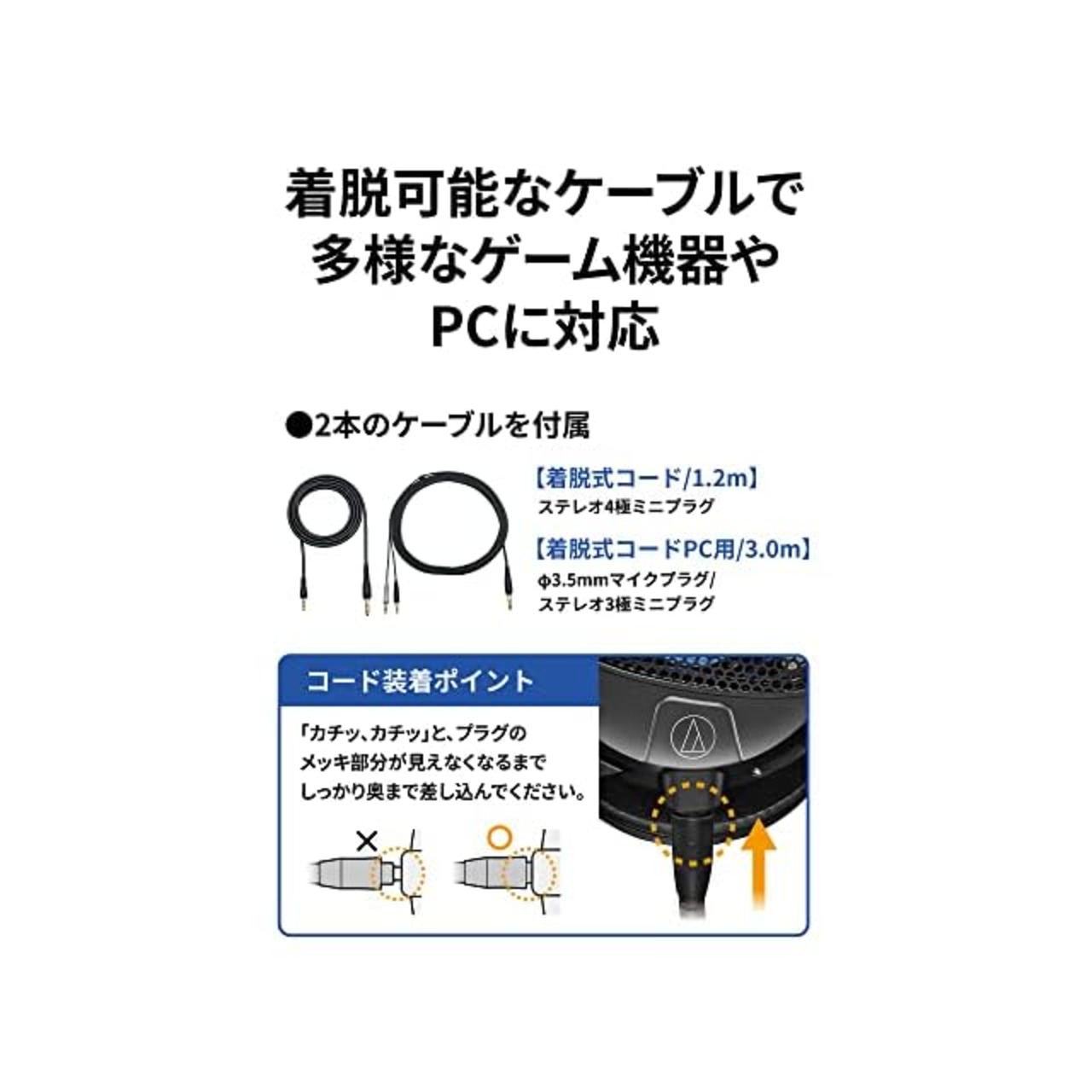 【着脱可能な2本のケーブルで 多様なゲーム機器やPCに対応】着脱可能な2本のケーブルを付属。PS5やXbox Series Xなどのゲーム機器には3.5mm ステレオ4極ミニプラグを備えた1.2mケーブルを、デスクトップPCには3.5mmマイクプラグと3.5mmステレオ3極ミニプラグを備えた3.0mケーブルを用意し、多様な機器へ接続することができます。