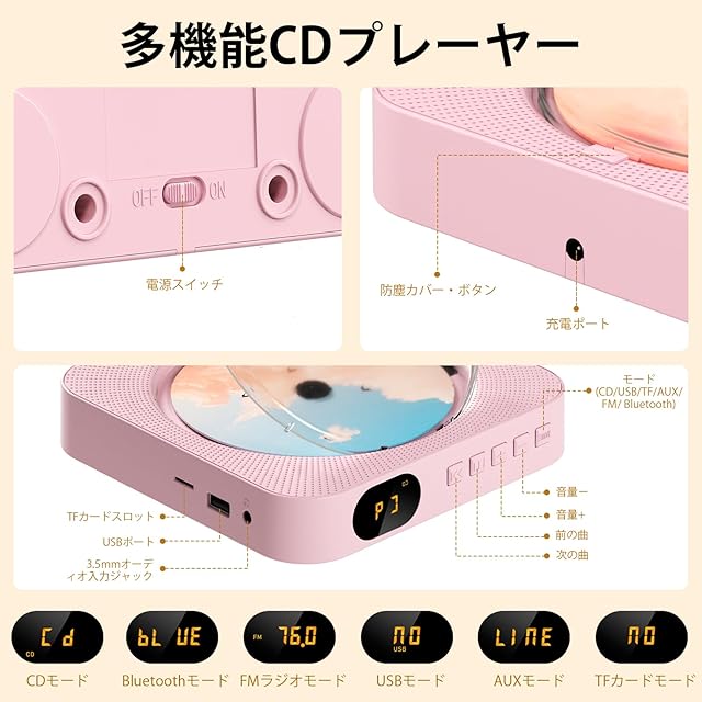 【多機能コンパクトCDプレーヤー】このbluetooth対応cdプレーヤーは、手のひらサイズに多彩な機能を詰め込みました。CD/CD-R/CD-RW/MP3/WMA形式に対応したポータブルCDプレーヤーとしてはもちろん、FMラジオ、Bluetooth対応Hi-Fiスピーカー、TFカード再生、ミニホームスピーカー、さらにUSBメモリからの音楽再生にも対応。これ一台で、さまざまな音楽体験をお楽しみいただけます。