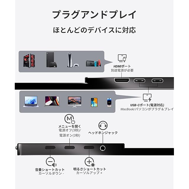Ingnokモバイルディスプレイは、2つのフル機能USB Type-Cポートと1つのミニHDMIポートを搭載しており、ほとんどのパソコン、PC、スマホ、PS4/5、X-box、Switch、TVボックスと互換性があります。様々なデバイスとの接続が簡単に行えます。スマホと接続する際には、スマホにフル機能のUSB 3.1 Type Cポートが必要です。