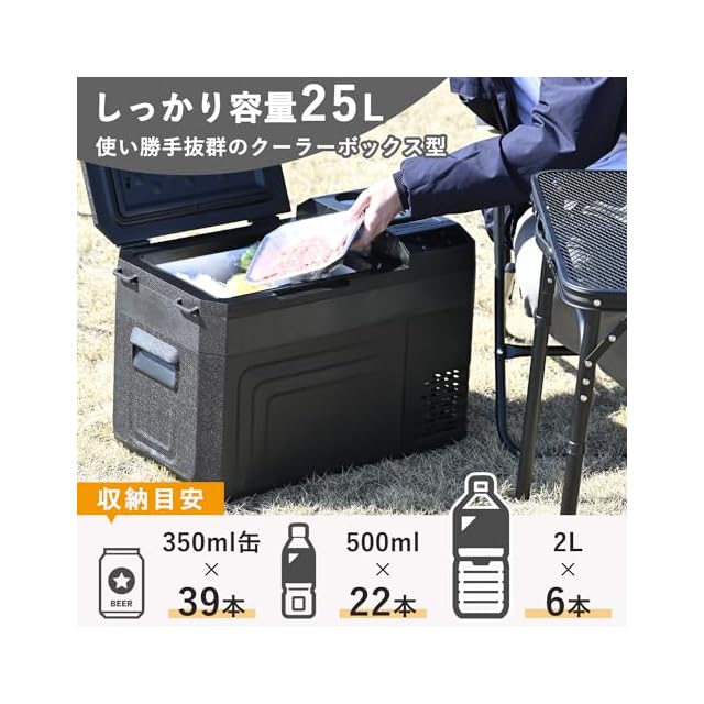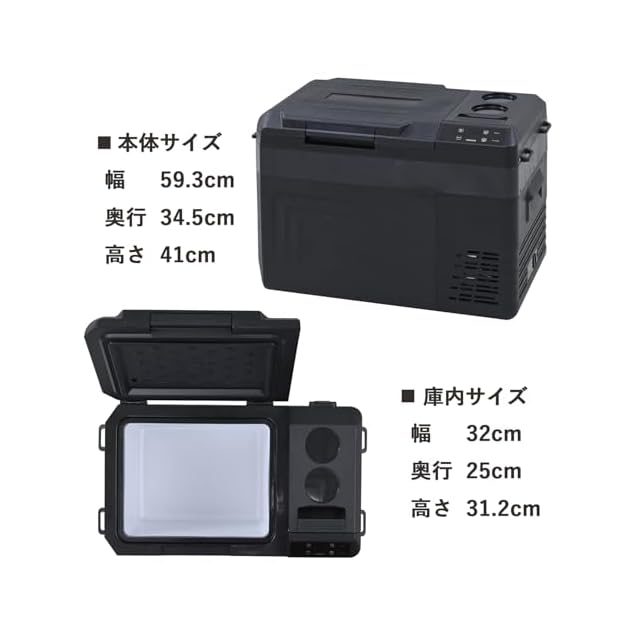 【商品仕様】◇本体サイズ:幅59.3×奥行34.5×高さ41cm ◇本体重量:11.2kg ◇電源:家庭用電源(ACアダプター使用)AC100V、シガーソケット DC12V 6A/DC24V 3A ◇定格消費電力:60W ◇定格内容量:25L ◇電源コードの長さ:AC=2.15m(ACアダプター含む)、DC=2.5m ◇付属品:電源コード、家庭用AC アダプター、シガーソケット用コード、取扱説明書 ◇期間:お買い上げ日より1年間。(の範囲については、取扱説明書をご確認ください。(一般家庭用以外(業務用など)に使用された場合の故障及び損傷などは対象外となります))