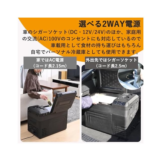 【選べる2WAY電源】車のシガーソケット(DC・12V/24V)のほか、家庭用の交流(AC)100Vのコンセントにも対応しているので、車載用として食材の持ち運びはもちろん、自宅のお部屋でパーソナル冷凍冷蔵庫としても使用できます。
